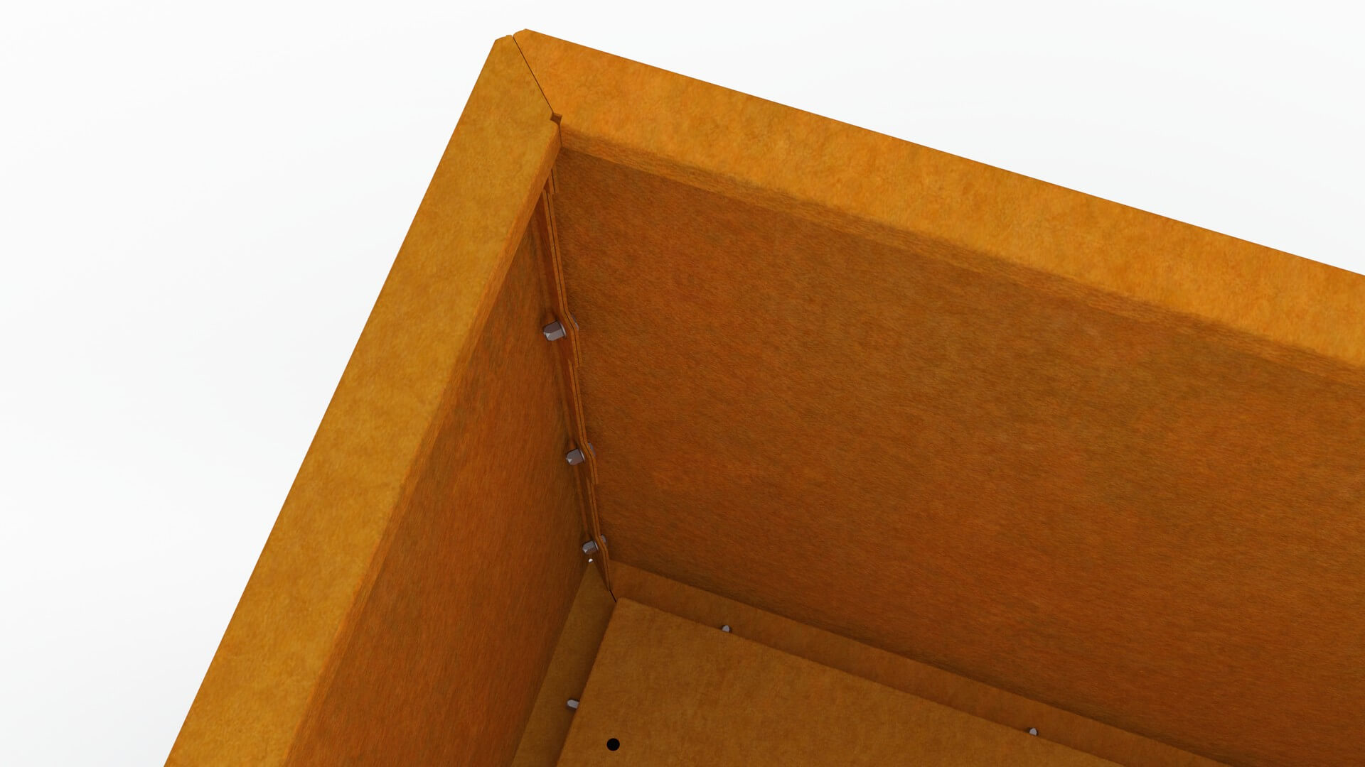 • Nahaufnahme der Ecke des Pflanzkübels Flamula mit Darstellung der einfachen Montage mit seitlichen Schrauben.